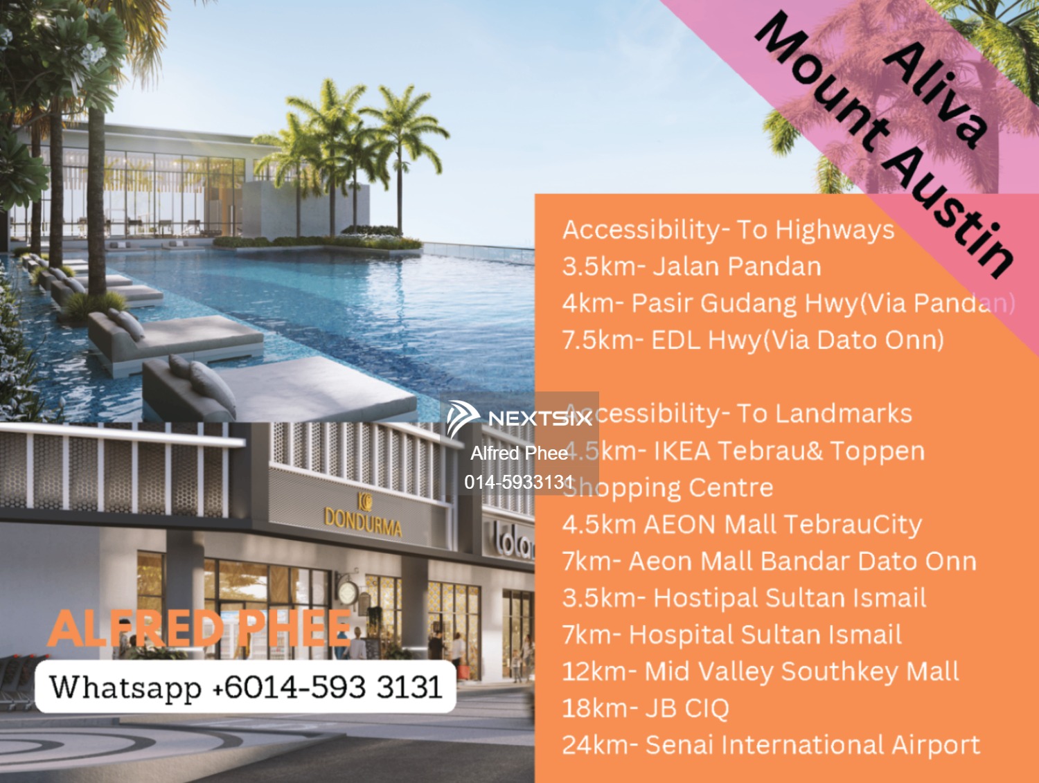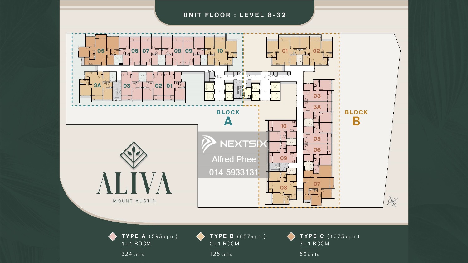 「ALIVA」则源于“珍贵的礼物” 占地2 Acres 类型为 Serviced Apartment Freehold 永久地契 两座 Tower 分别为Tower A & Tower B 一共499间住宅单位,Tower A-250间,Tower E Tower A底楼有11 同商业店铺 Commercial ALIVA 款式有: Type A-1+1 Bedrooms (1) Carpark) Type B-2+1 Bedrooms (1 Carpark) Type C-3+1 Bedrooms (3 Carparks) Price Range (Nett Price after rebata): Type A-1+1 Bedrooms: 394,400-441,950 Type B-2+1 Bedrooms: 539,300-587,300 Type C-3+1 Bedrooms: 684,675-726,950 Maintenance fee estimated RM0.45 psf Management - 国际知名物业管理公司 Knight Frank 每座有4部电梯 每楼分配为以下。 •Level 1 Main Lobby •Level 2-6: Car Park Floor •Level 7: Facilities Floor •Level 8-32: Resident Floor 每层楼40个单位