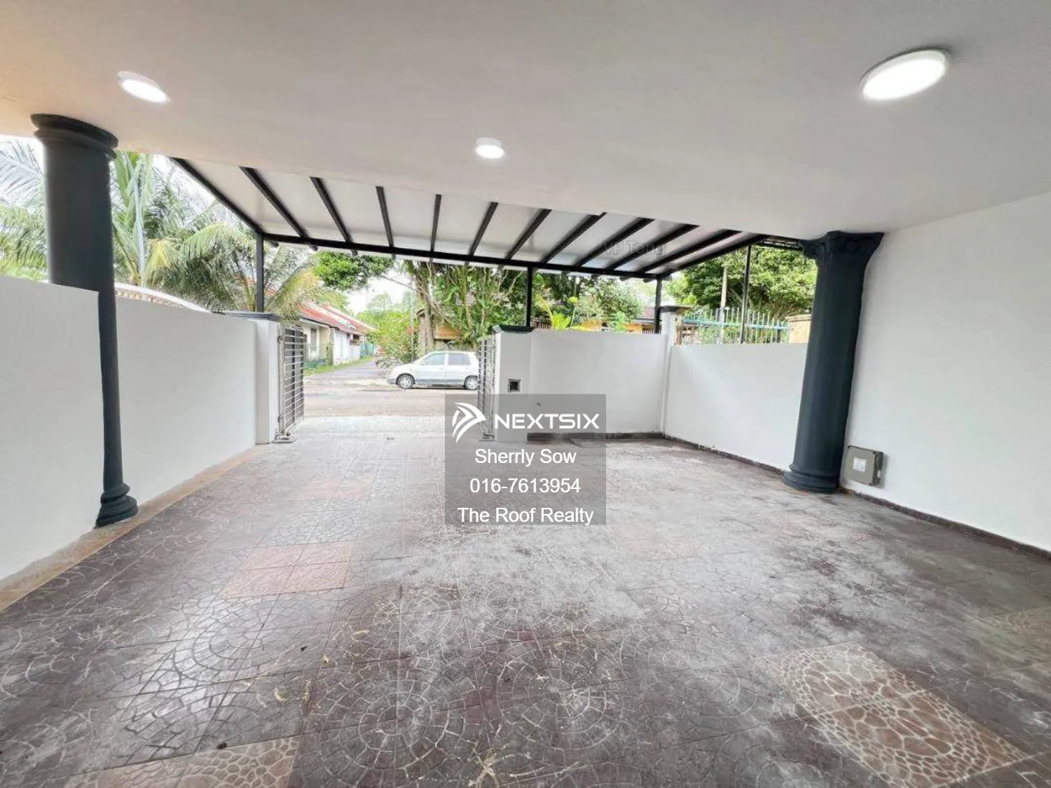 - Acp awning - Car porch mosaic - Main auto gate door - Safety Door front and back - Plaster ceiling - Living Hall 800x800 mosaic - Kitchen extension - Kitchen table top with drawer cabinet